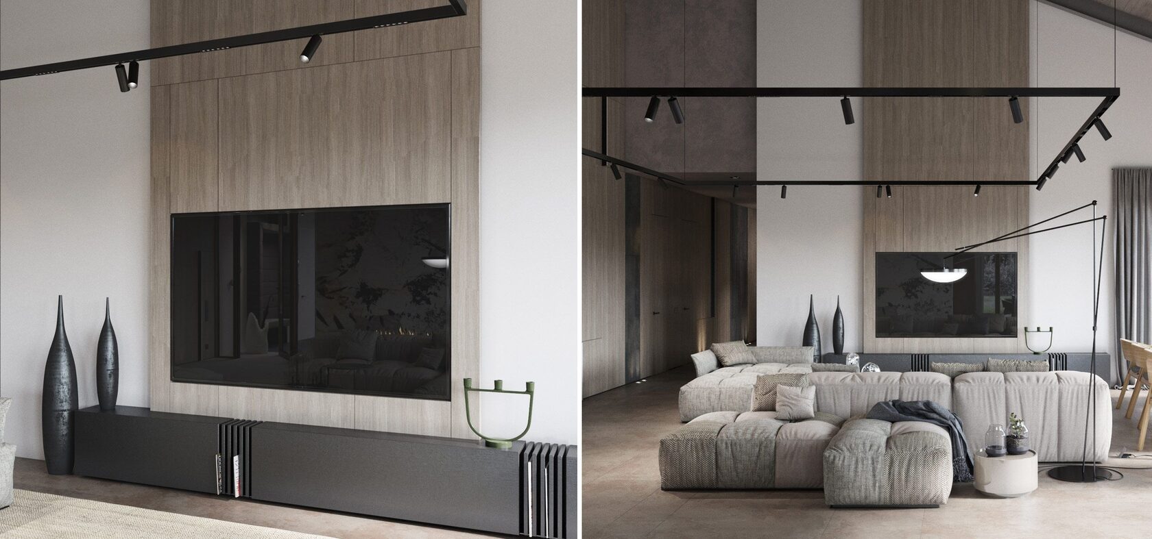 Высокий накладной или подвесной шинопровод. Все коннекторы светильников и коннекторы питания, будут утоплены в шинопроводе. Ширина шинопровода: 30 мм Высота шинопровода: 50 мм Безопасное напряжение в шинопроводе: 48 V